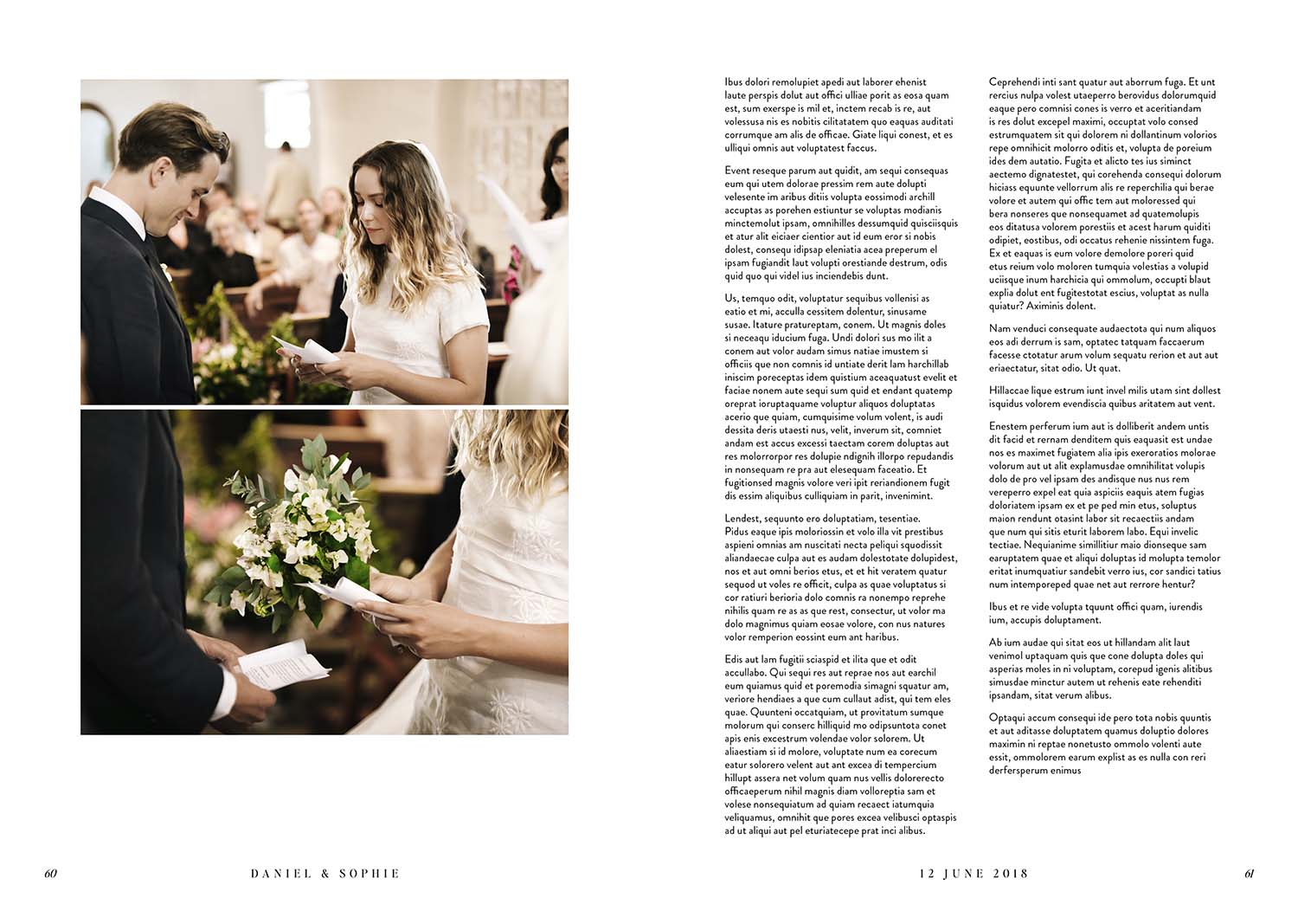 Some of the features in the Editorial style kit includes a table of contents, section breaks and page numbering throughout the magazine design to help navigate your wedding day story and ability to easily jump to a certain section of the day. Fonts for big text moments, loved-up quotes, large-scale headers and easy-to-read typefaces for long-form paragraphs.